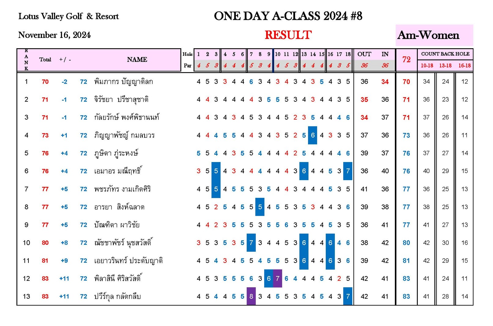 Amateur Class  นักกอล์ฟสมัครเล่น ชาย-หญิง อายุ 13 ปีขึ้นไป แข่งขันรูปแบบ Scratch Competition Stroke Play(Gross Score)  ชิงเงินรางวัลรวม 33,500 บาท
